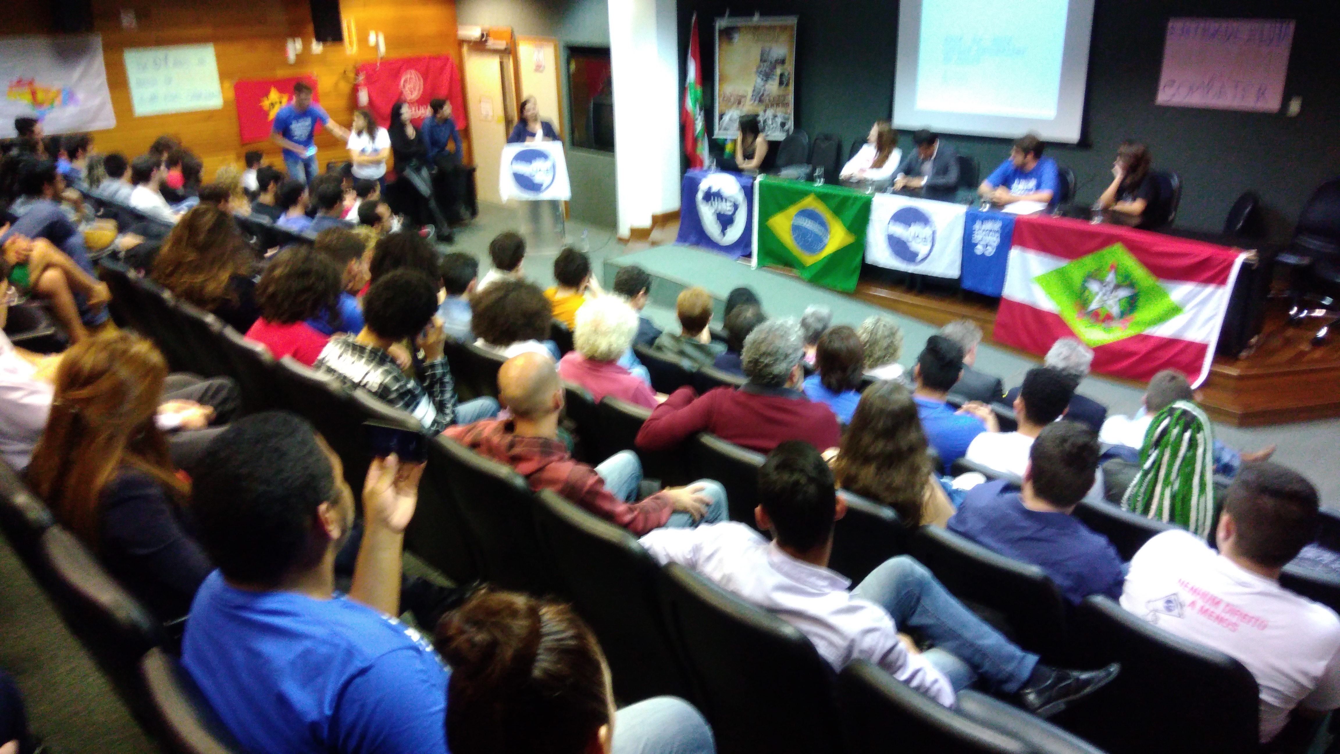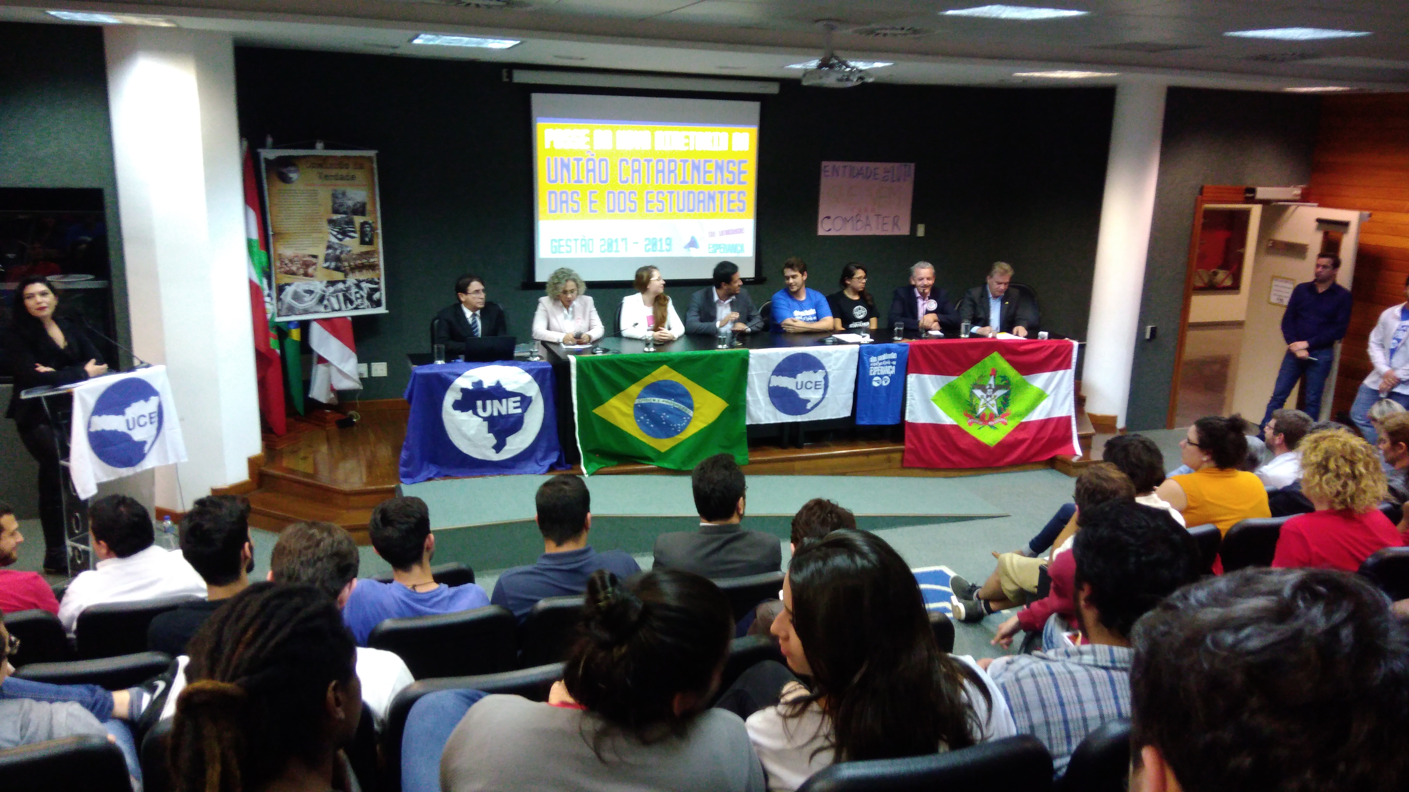 A cerimônia de posse da nova diretoria da União Catarinense dos e das Estudantes (UCE) aconteceu na terça-feira (24), no plenarinho deputado Paulo Stuart Wright, na Assembleia Legislativa de Santa Catarina. O evento contou com a participação dos deputados Cesar Valduga (PCdoB), Ana Paula Lima e Dirceu Dresch (PT), e Antônio Aguiar (PMDB), além de representantes do Governo do Estado, lideranças de movimentos sociais e comunitários, além de representantes de centros acadêmicos de universidades de todo o Estado.
