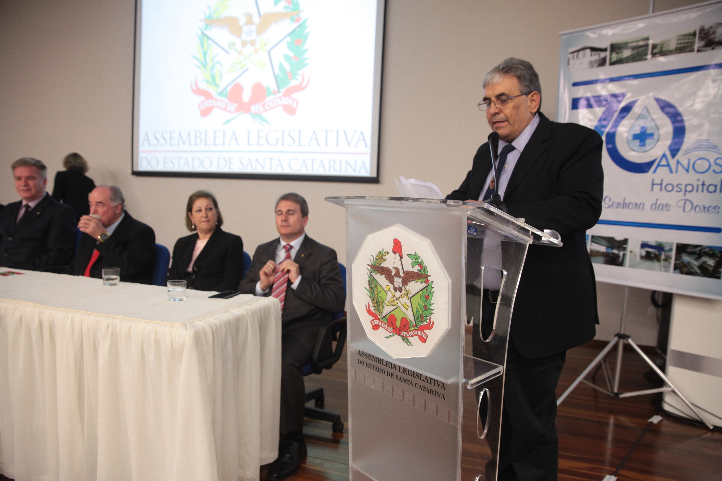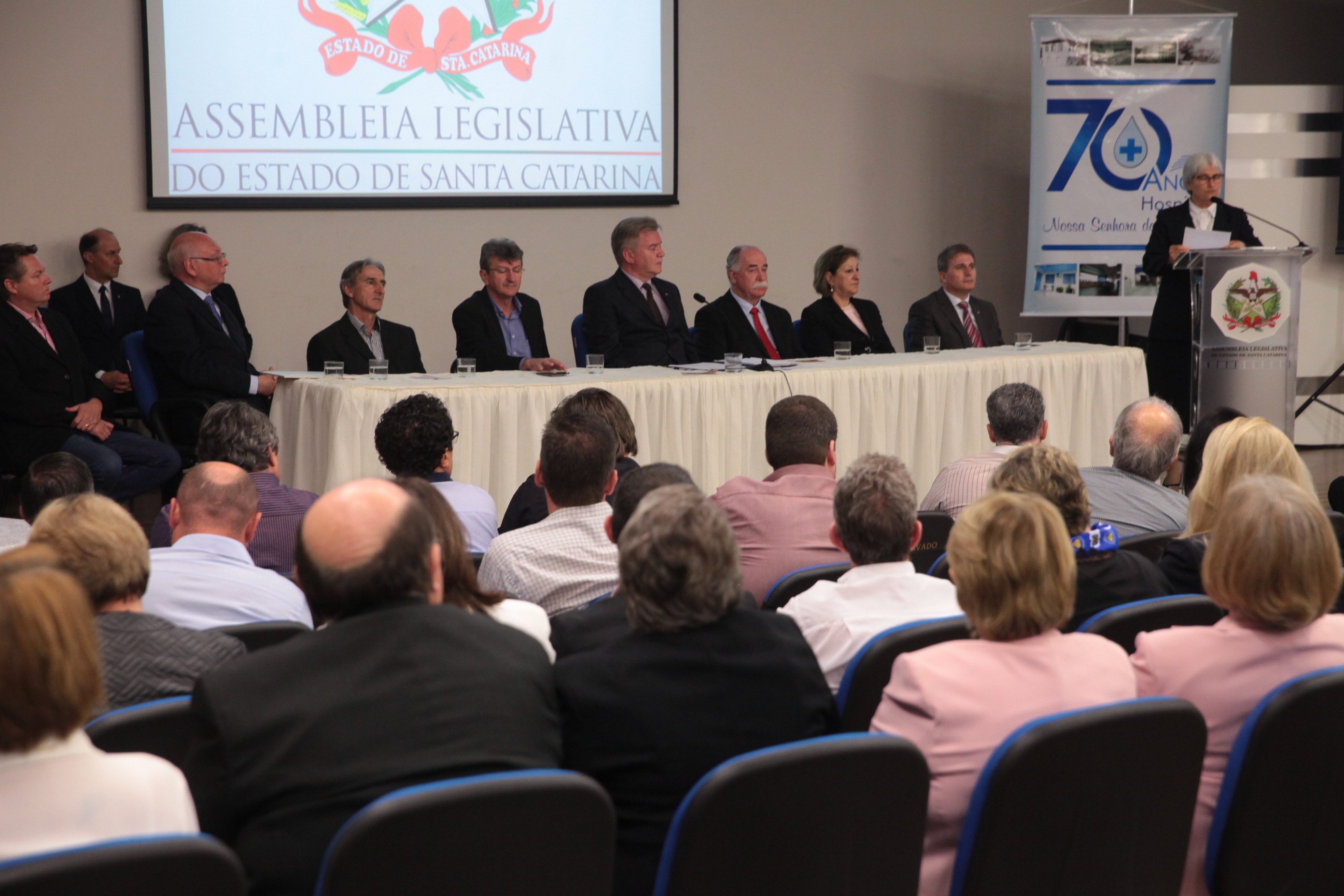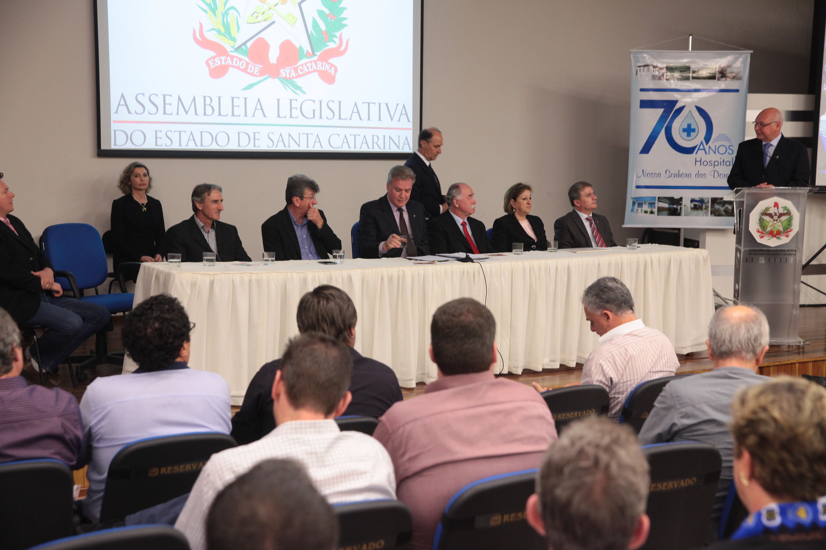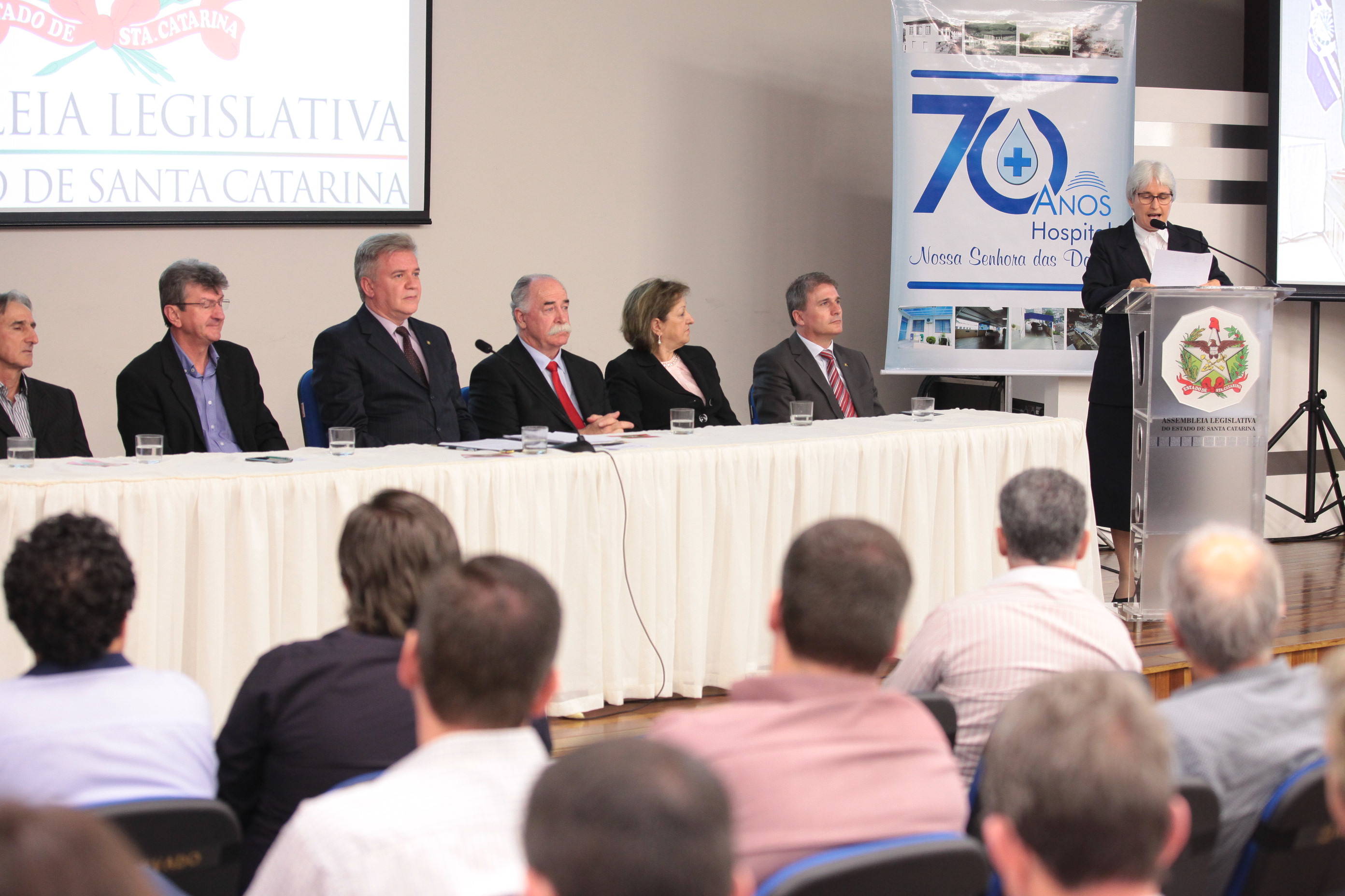 Os 70 anos de criação Hospital Nossa Senhora das Dores, de Capinzal, foram destacados na noite desta segunda-feira (30), em uma sessão solene realizada pela Assembleia Legislativa de Santa Catarina. A solenidade aconteceu na Universidade do Oeste de Santa Catarina (Unoesc), campus Capinzal, e reuniu lideranças políticas da região do Meio-Oeste, representantes de entidades de classe, de congregações religiosas e profissionais da área da saúde.